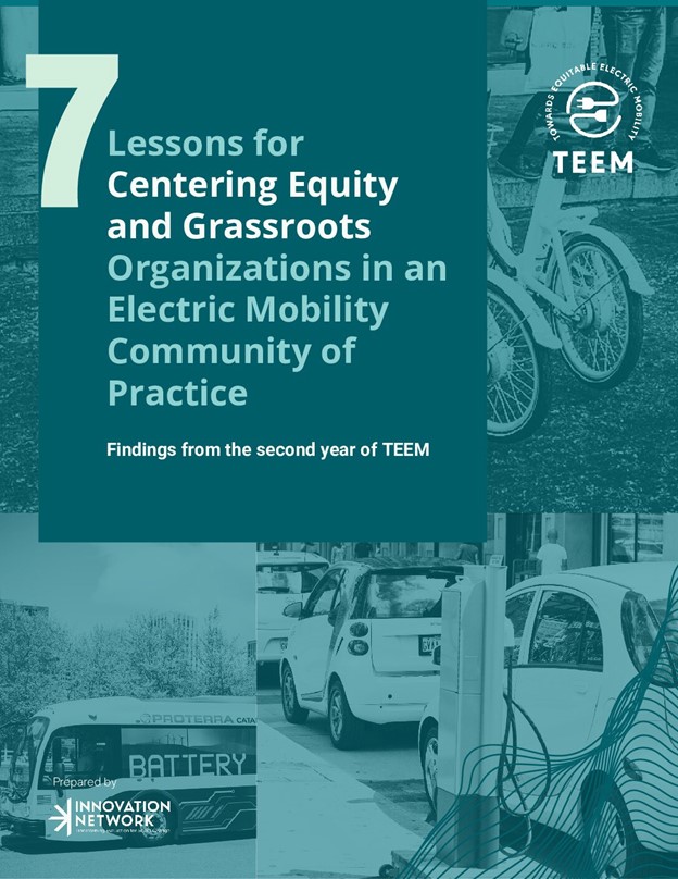 Toward Equitable Electric Mobility (TEEM) disrupts the electric mobility policy landscape by bringing traditional environmental groups and equity groups together. As part of the TEEM community of practice, these groups learn from each other, build relationships and capacity, and take shared action with the ultimate goal of advancing racial equity and climate change goals in electric mobility. Since 2021, TEEM has partnered with Innovation Network to evaluate and learn from the implementation of TEEM. In TEEM’s second year, the evaluation explored how TEEM can support proactive work for equitable policies, how to build collective ownership of TEEM’s strategies, and how to operationalize equity within the community of practice. Findings were validated with funders, facilitators, and members of TEEM. This brief distills seven lessons from the evaluation for centering equity within the collective.