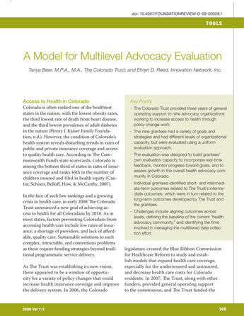 An evaluator and funder discuss an ongoing evaluation designed to build grantees’ capacity to evaluate their work and incorporate real-time feedback into their strategies; monitor the progress of each grantee toward its unique policy goals; and assess growth in capacity of the health advocacy community of Colorado as a whole. Featured in The Foundation Review, 1(3), 149-161.